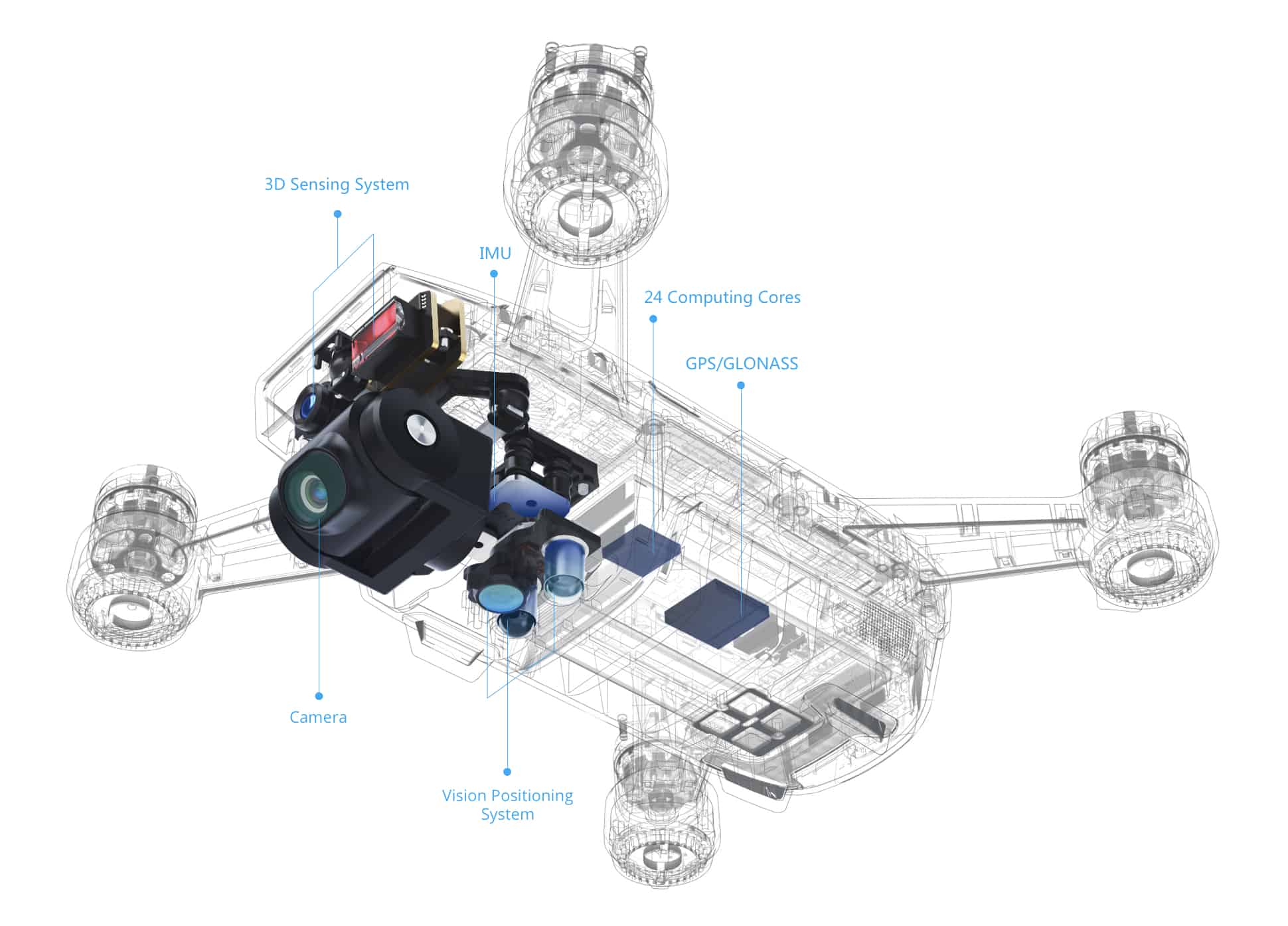- Other features include VPS, GPS, GLONASS and 3D sensing system to position the drone and fulfill the purpose.